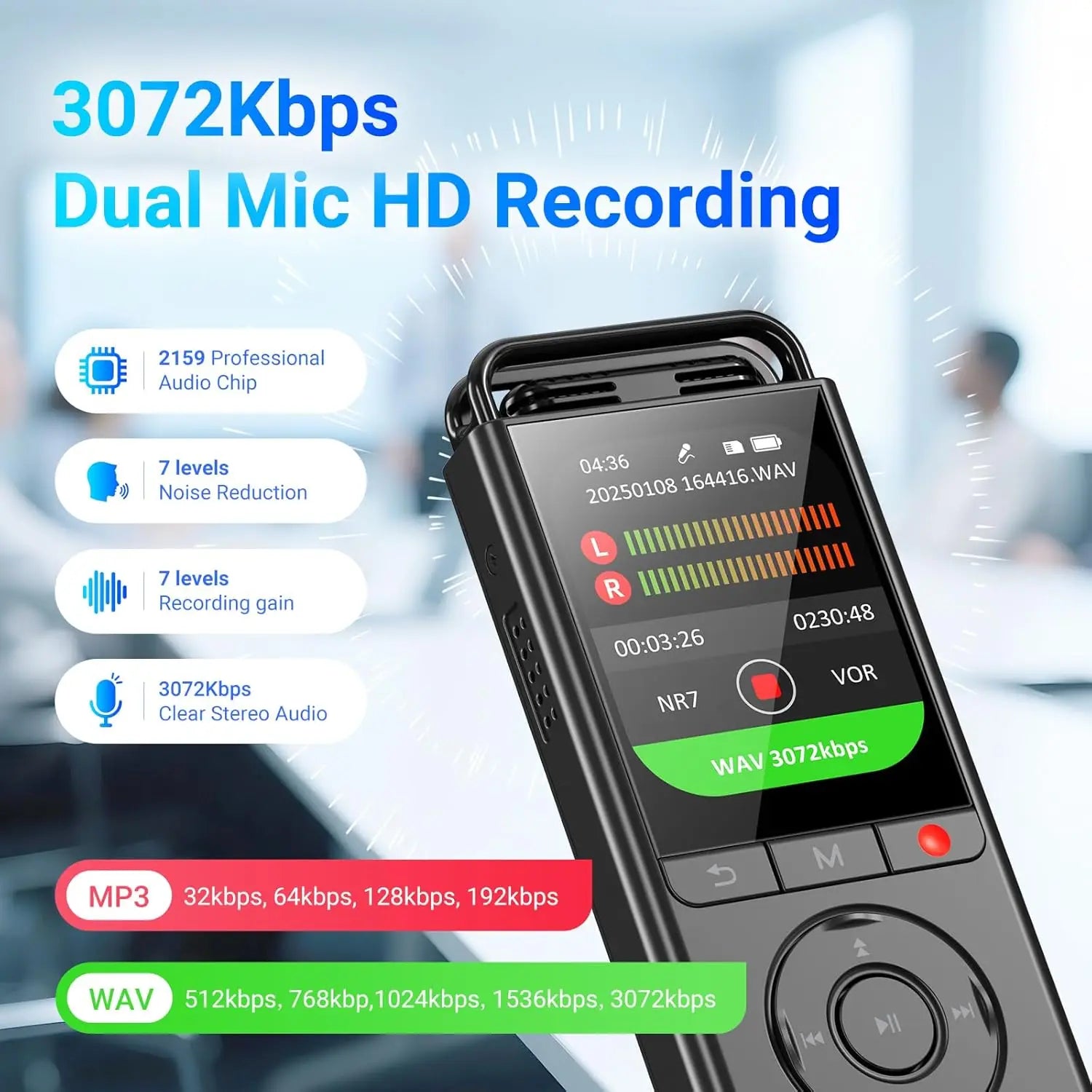 【Double Memory - 144GB Huge Capacity】MECHEN V06 Voice Recorder (4.28*1.65*0.5 inches) comes with 16GB of built-in storage and a 128GB TF card, you can store up to 9,000 hours of MP3 audio or 450 hours of HD 3072Kbps WAV audio. Beautifully crafted and durable, it's perfect for continuous meetings, interviews, or extended classroom sessions.