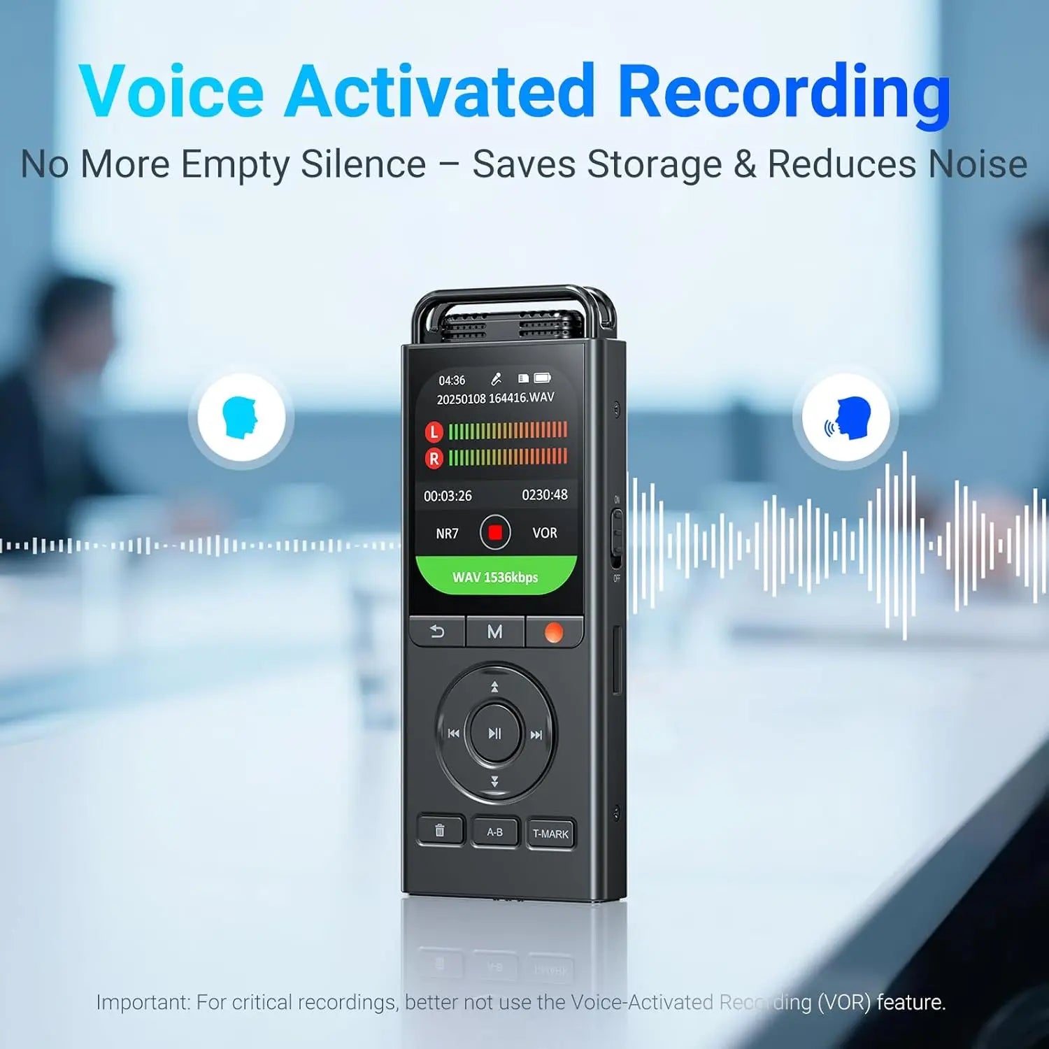 【Voice-activated Recording and Noise Reduction】7 levels of voice-activated sensitivity adjustment to capture the human voice clearly and accurately, without missing any important details of the conversation. When no one is speaking, the recorder will stop recording, reducing silent segments to save playback time and disk space.7 levels of noise filter can be adjusted according to your environment: reduce fan noise in the office, mitigate wind noise in outdoor recordings, or attenuate background conversations in lecture halls.